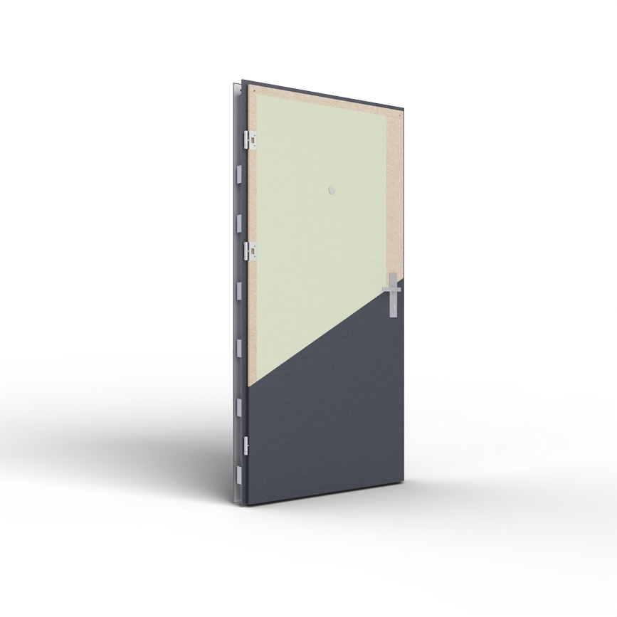 Trwałość to podstawa. Skrzydło drzwiowe jest wzmocnione ramiakiem drewnianym i pokryte obustronnie blachą stalową, pokrytą laminatem. Ościeżnica wykonana jest z grubego profilu stalowego, również pokrytego laminatem.