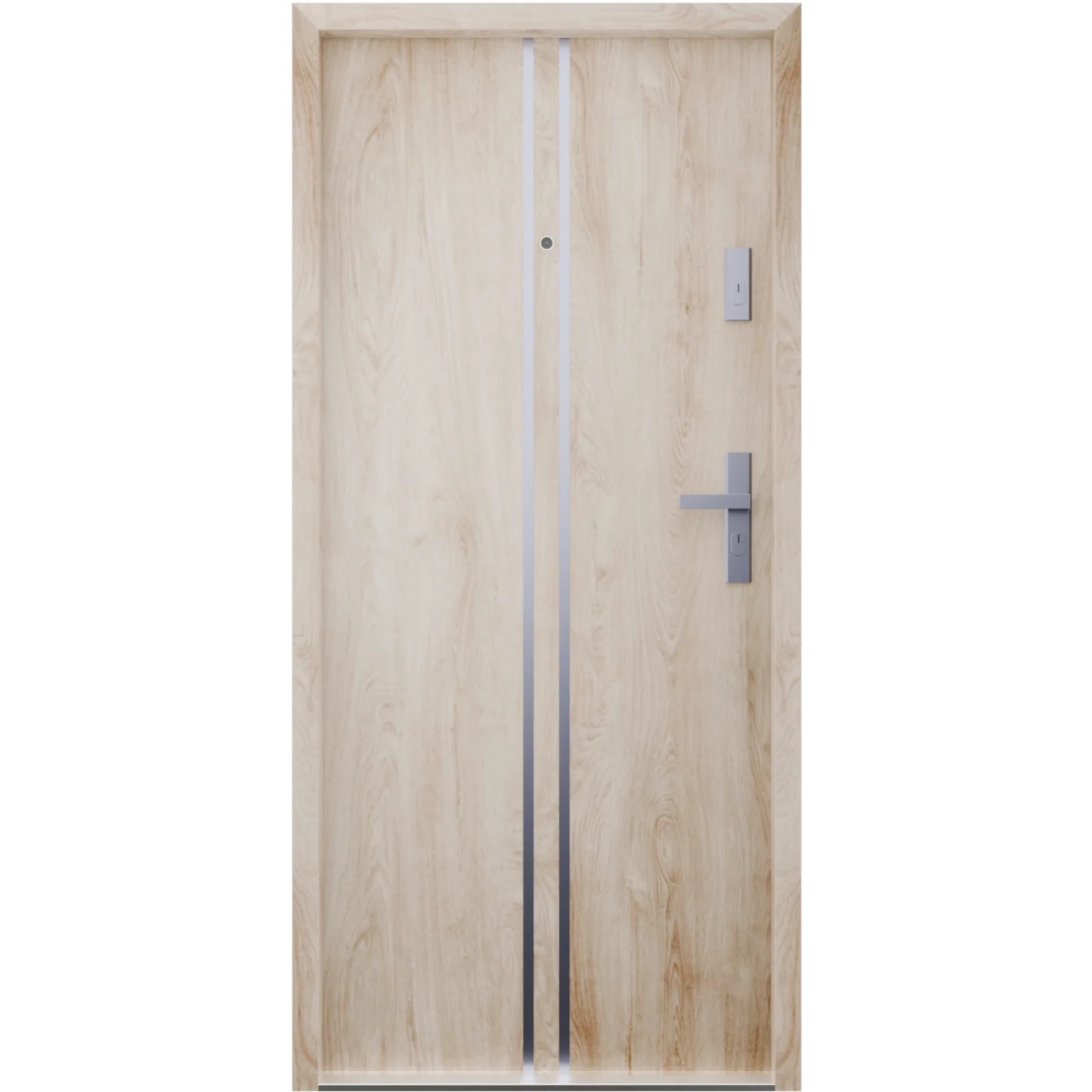 Drzwi klatkowe wejściowe do mieszkania w bloku antywłamaniowe RC3 wygłuszające 47 dB 55 mm stalowe z klamką inox srebrną i aplikacjami dąb turner A7