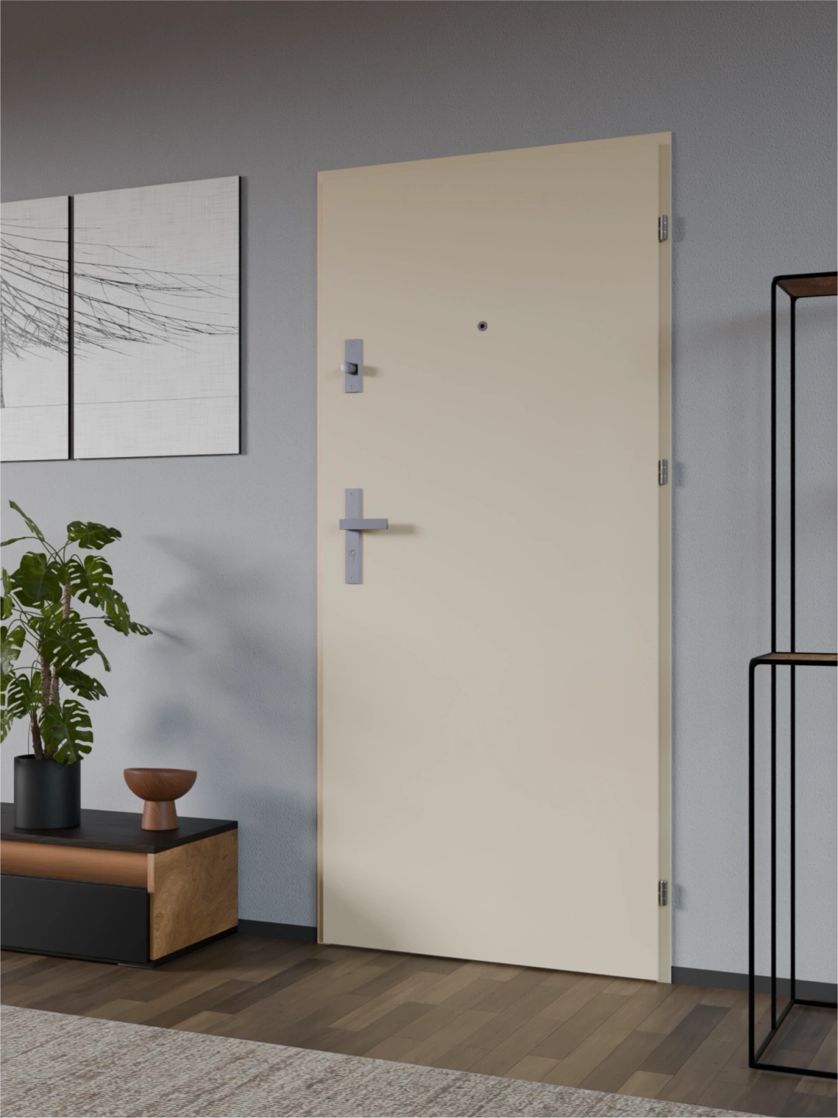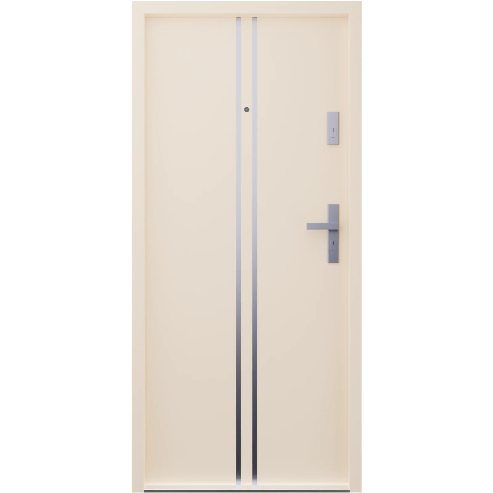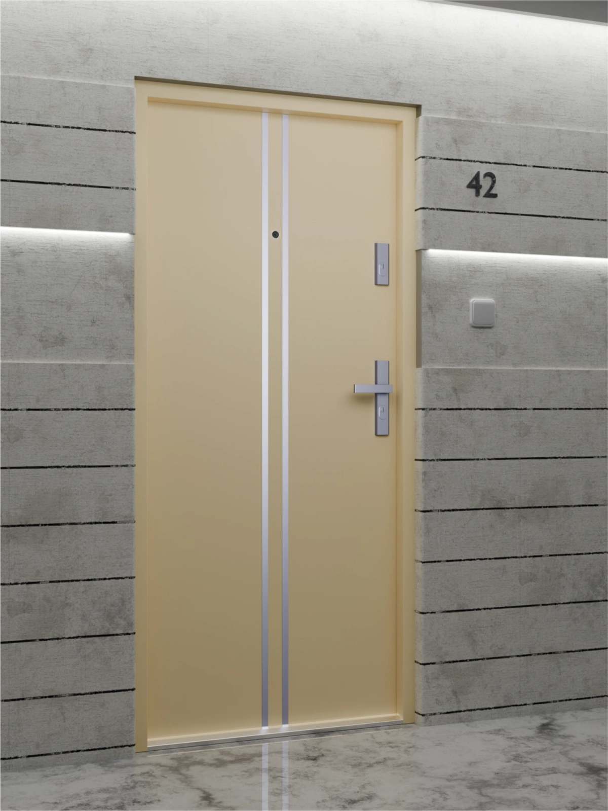 Drzwi klatkowe wejściowe do mieszkania w bloku wygłuszające 47 dB antywłamaniowe RC3 55 mm stalowe z klamką inox srebrną i aplikacjami beżowe A7