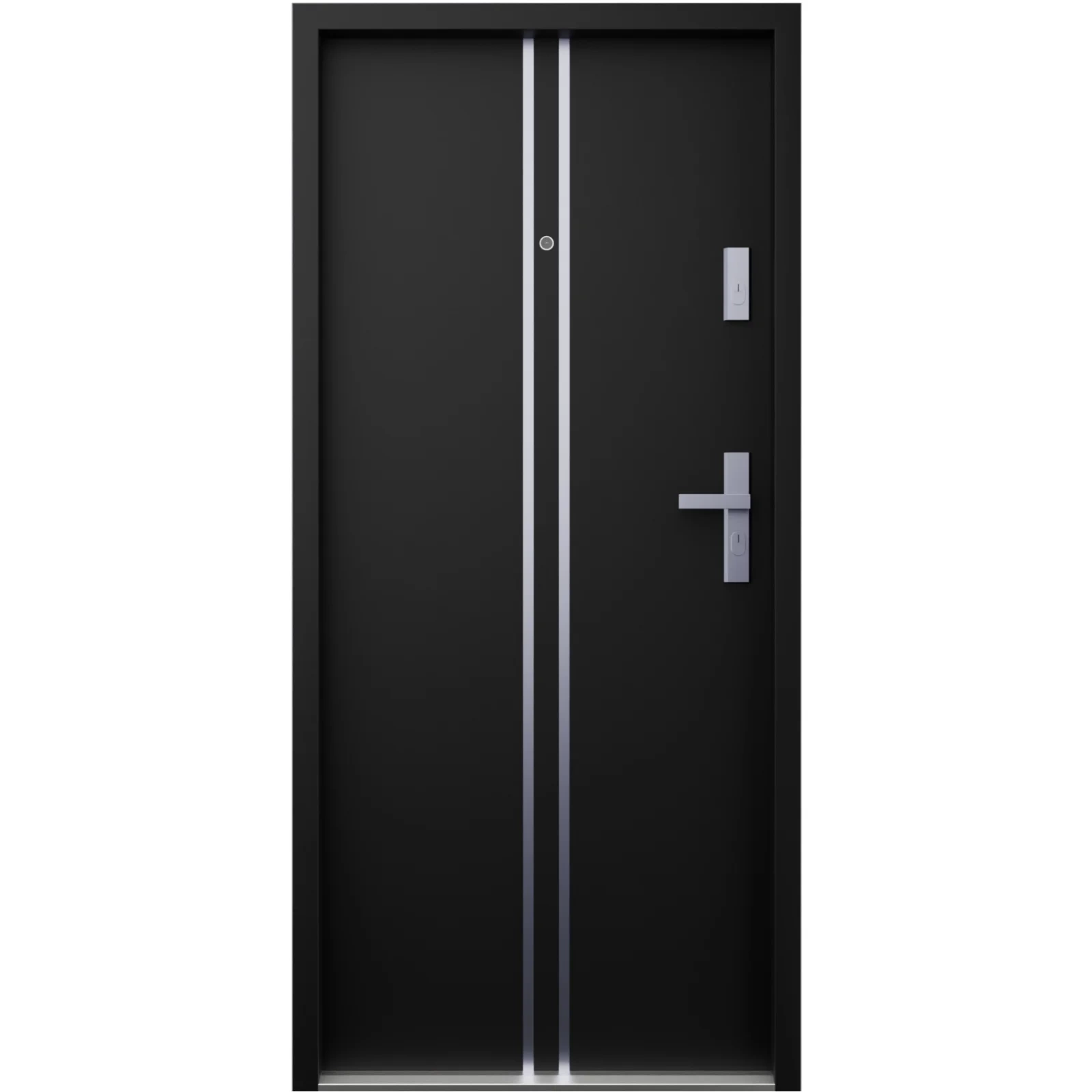 Drzwi klatkowe wejściowe do mieszkania w bloku wygłuszające 47 dB antywłamaniowe RC3 55 mm stalowe z klamką inox srebrną i aplikacjami czarne A7