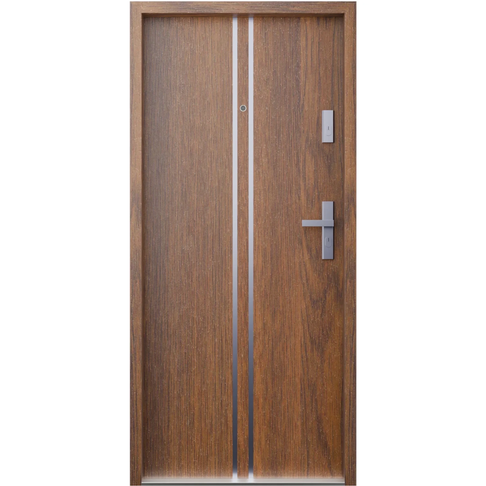 Drzwi klatkowe wejściowe do mieszkania w bloku wygłuszające 47 dB antywłamaniowe RC3 55 mm stalowe z klamką inox srebrną i aplikacjami orzech A7