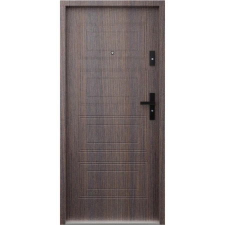 Drzwi klatkowe wejściowe do mieszkania w bloku wygłuszające 47 dB antywłamaniowe RC3 55 mm stalowe z tłoczeniami i klamką czarną dąb bagienny T34