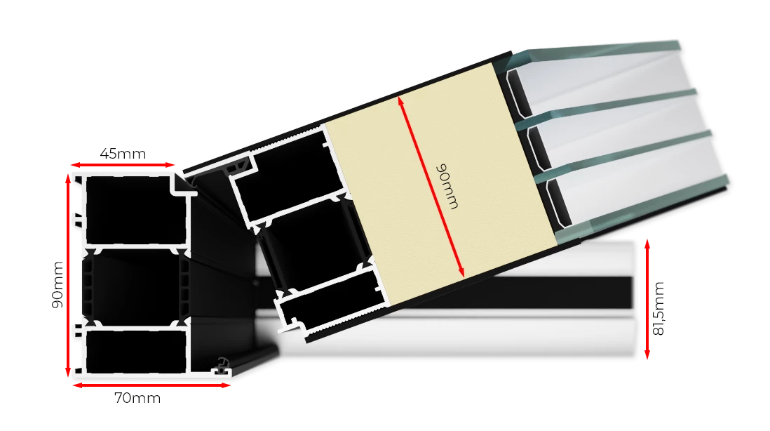 Skrzydło drzwi o grubości 90 mm posiada ramiak z profili aluminiowych z izolacją termiczną. Poszycie stanowią blachy aluminiowe, lakierowane proszkowo, wypełnione XPS-em (styrodur). Na całym obwodzie skrzydła zamontowano uszczelkę systemową. Współczynnik przenikania ciepła dla drzwi bez przeszklenia wynosi 0,8 W/m²K, dla drzwi z przeszkleniem (wkład 4 szybowy) wynosi 0,98 W/m²K. Skrzydło zlicowane z ramą drzwi może być wyposażone w pochwyt (antabę) o długości 1600 mm, 1200 mm lub 500 mm z wewnętrzną klamką i elektrozaczepem lub klamko – klamkę, zamek 5-punktowy Winkhaus oraz wkładkę patentową z 3 kluczami. W standardzie drzwi posiadają certyfikowane zabezpieczenia przed włamaniem w klasie RC2. Drzwi Premium Alu 90 dostępne są wielu modelach i kolorach. Możesz wybrać drzwi pełne bez przeszklenia lub przeszklone. Niezależnie od wybranego modelu szklenia możesz wybrać szybę przezroczystą, satynową nazywaną inaczej mleczną, przyciemnioną w kolorze grafitowym oraz odbijającą reflex również w kolorze grafitowym. Zdjęcia poglądowe umożliwiające zorientowanie się w rodzajach przeszkleń znajdują się w dolnej części tej strony produktowej.