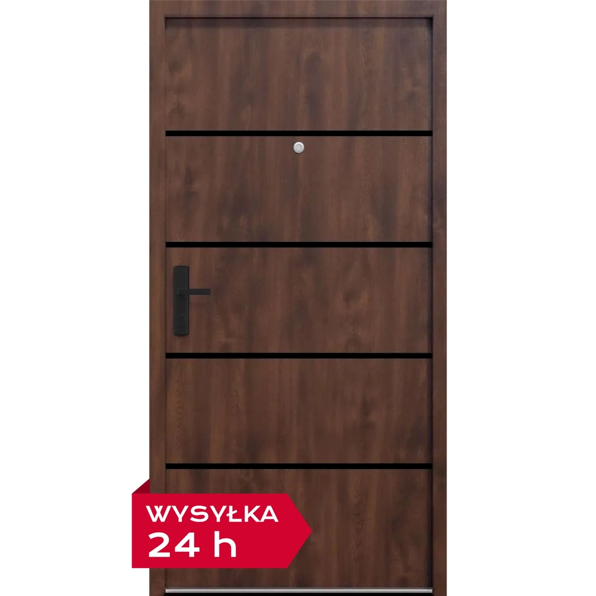 Trwałość to podstawa. Skrzydło drzwiowe jest wzmocnione ramiakiem drewnianym i pokryte obustronnie blachą stalową, pokrytą laminatem. Ościeżnica wykonana jest z grubego profilu stalowego, również pokrytego laminatem.
