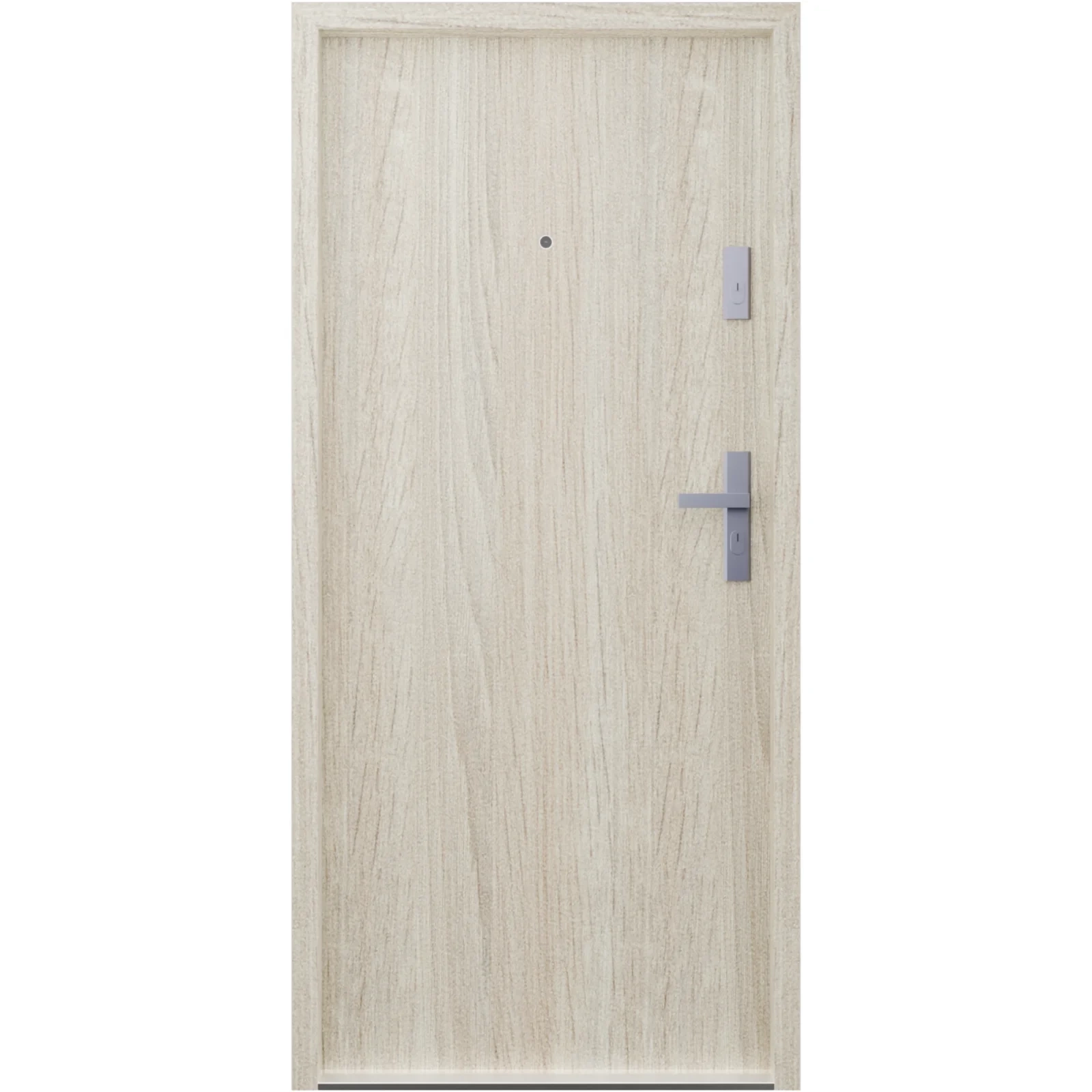 Drzwi wewnątrzklatkowe akustyczne wyciszające 47 dB z Certyfikatem antywłamaniowe RC3 55 mm stalowe gładkie z klamką inox srebrną dąb sonoma G00