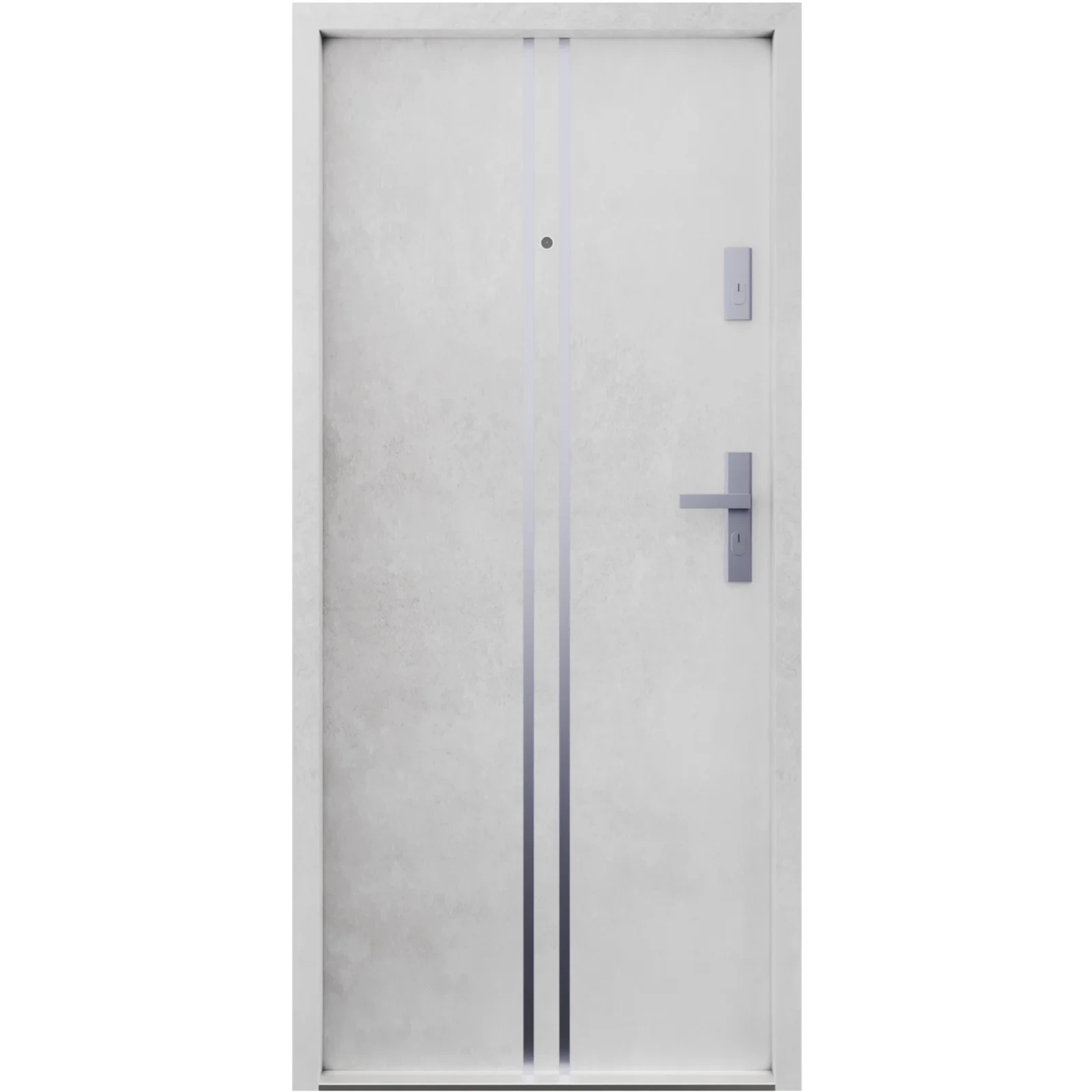 Drzwi wewnątrzklatkowe akustyczne wyciszające 47 dB z Certyfikatem antywłamaniowe RC3 55 mm stalowe z klamką inox srebrną i aplikacjami beton A7