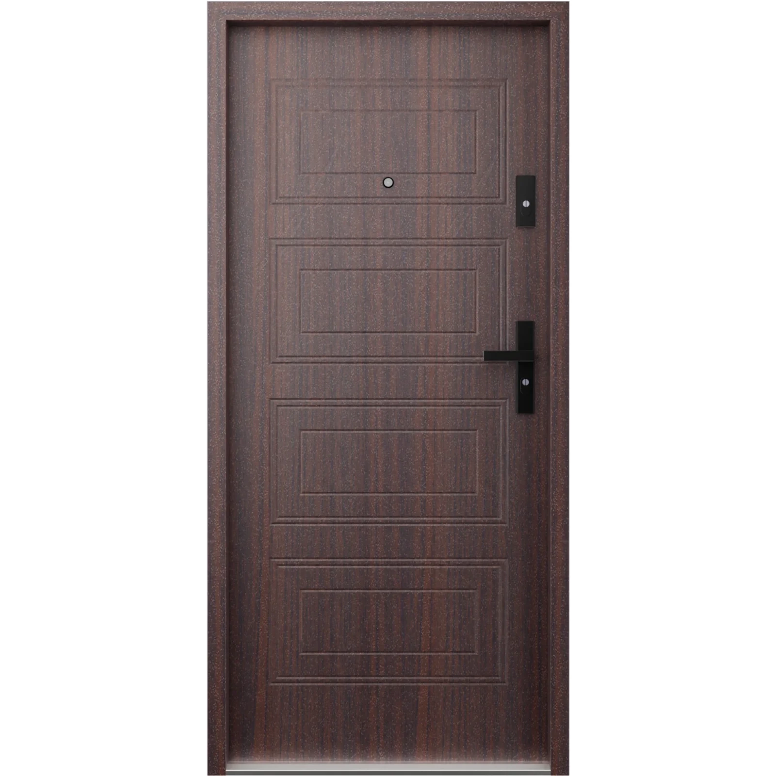 Drzwi wewnątrzklatkowe akustyczne wyciszające 47 dB z Certyfikatem antywłamaniowe RC3 55 mm stalowe z tłoczeniami z klamką czarną mahoń T34