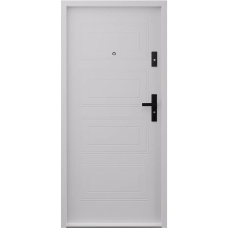 Drzwi wewnątrzklatkowe akustyczne wyciszające 47 dB z Certyfikatem antywłamaniowe RC3 55 mm stalowe z tłoczeniami z klamką czarną szare T34