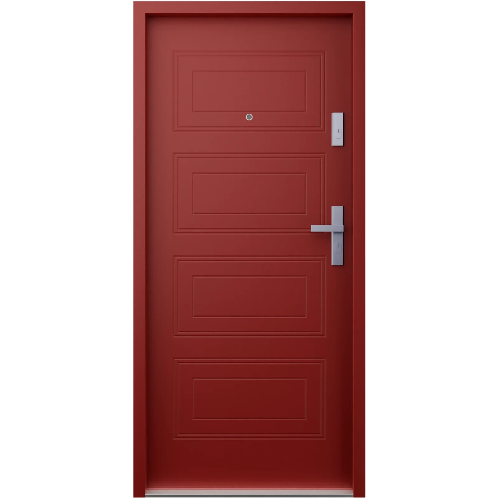 Drzwi wewnątrzklatkowe akustyczne wyciszające 47 dB z Certyfikatem antywłamaniowe RC3 55 mm stalowe z tłoczeniami z klamką inox srebrną czerwone T34