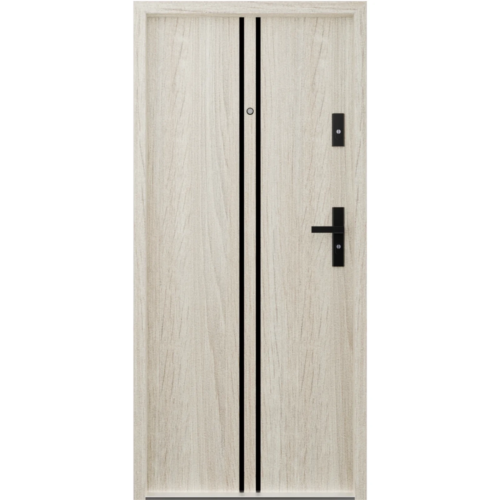 Drzwi wewnątrzklatkowe antywłamaniowe RC3 z Certyfikatem akustyczne wyciszające 47 dB 55 mm stalowe z klamką czarną i aplikacjami dąb sonoma A7