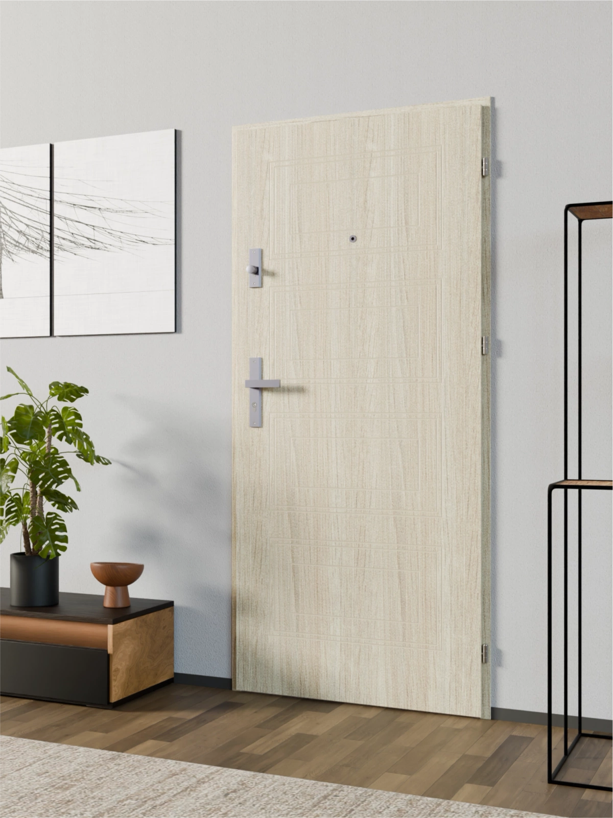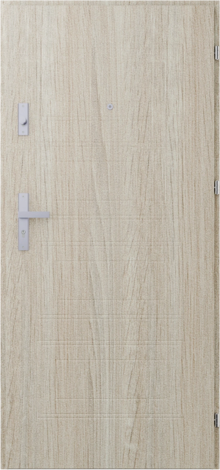Drzwi wewnątrzklatkowe antywłamaniowe w klasie RC4 55 mm stalowe z klamką i zawiasami srebrnymi inox dąb sonoma T34