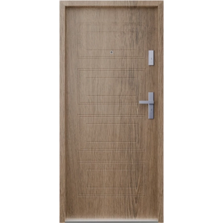 Drzwi wewnątrzklatkowe antywłamaniowe w klasie RC4 55 mm stalowe z klamką i zawiasami srebrnymi inox dąb trufla T34