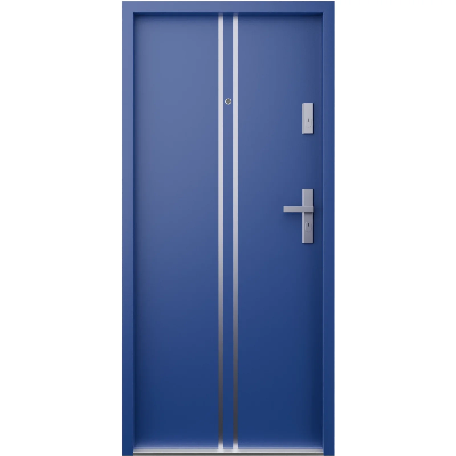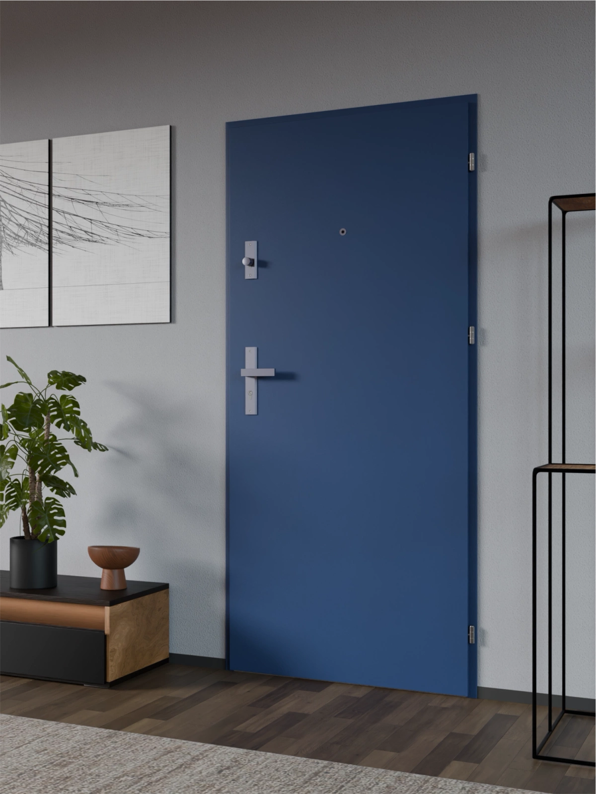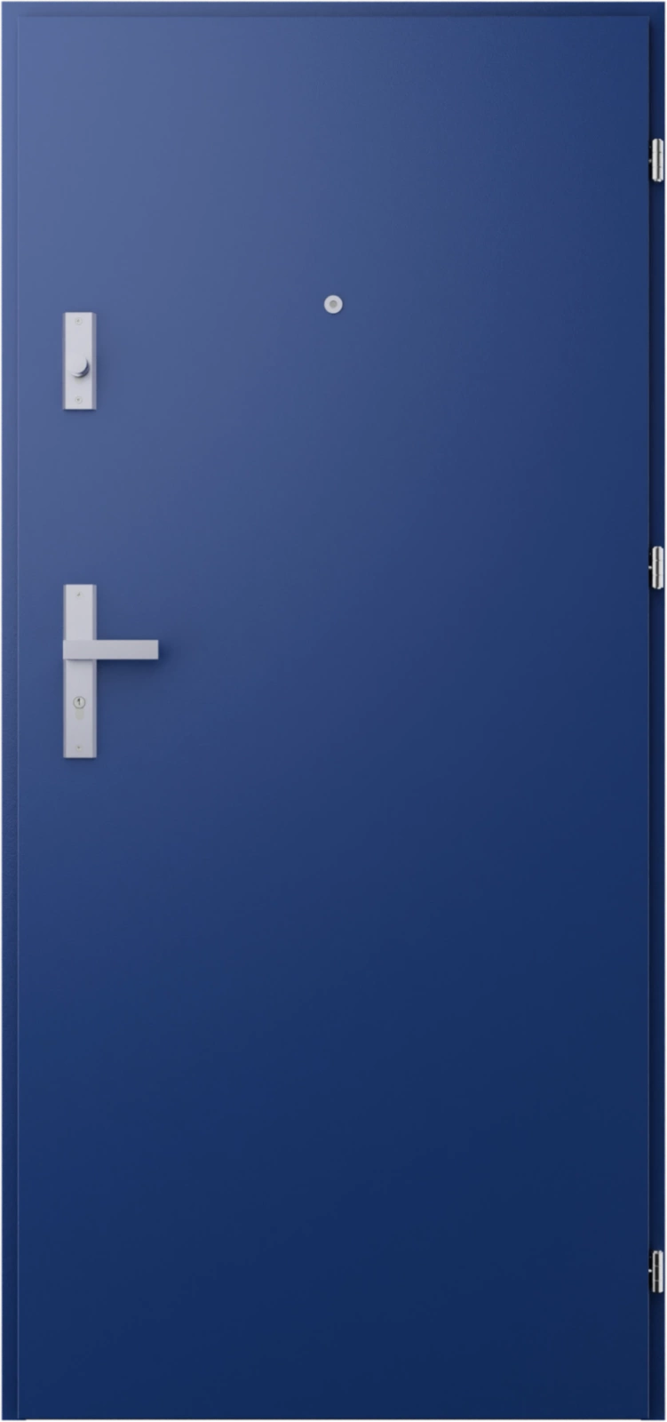 Drzwi wewnątrzklatkowe antywłamaniowe w klasie RC4 55 mm stalowe z klamką i zawiasami srebrnymi inox niebieskie A7