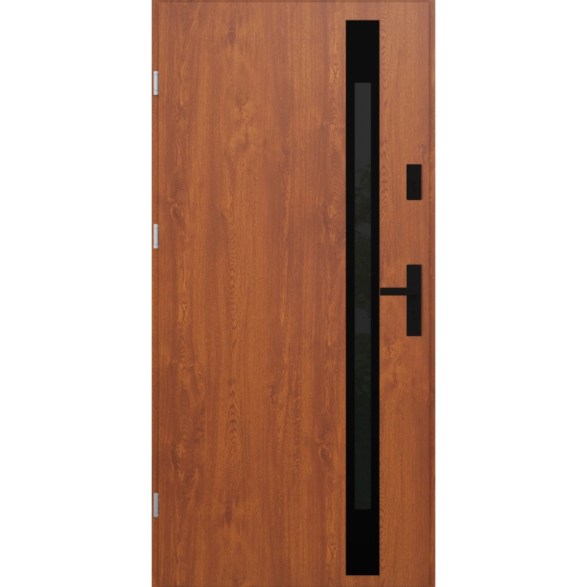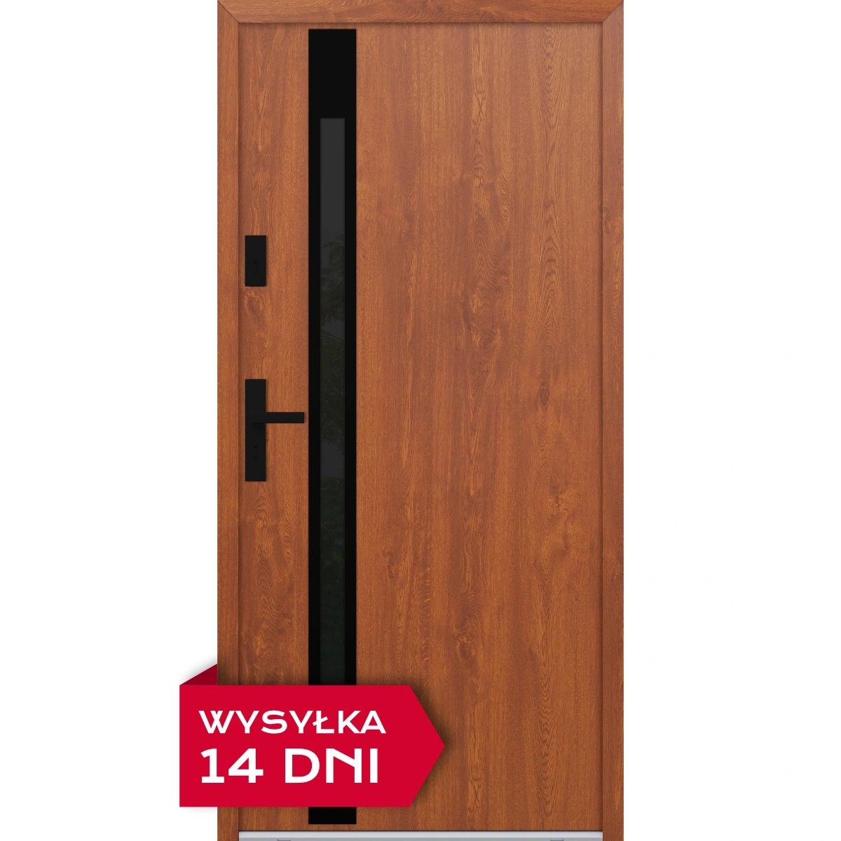 Drzwi zewnętrzne do domu stalowo aluminiowe 68 mm z szybą i czarnymi okuciami ATU68 złoty dąb Program Czyste Powietrze M534