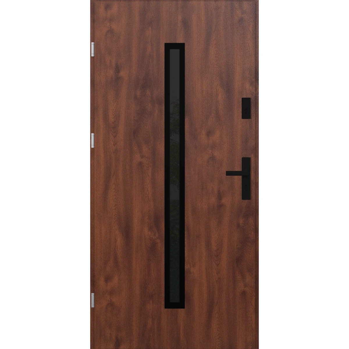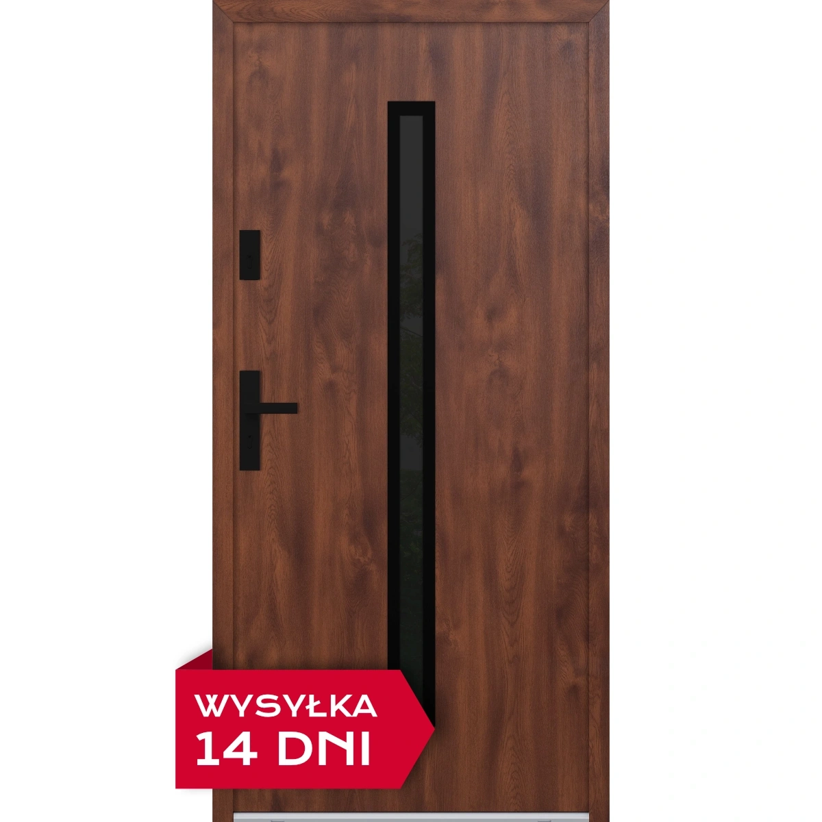 Drzwi zewnętrzne do domu stalowo aluminiowe 68 mm z szybą i klamką czarną ATU68 orzech Program Czyste Powietrze M521