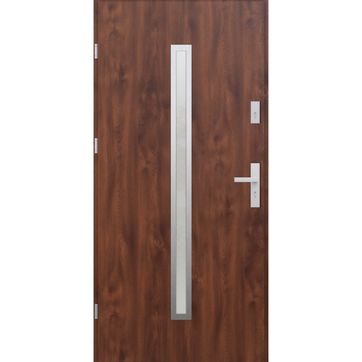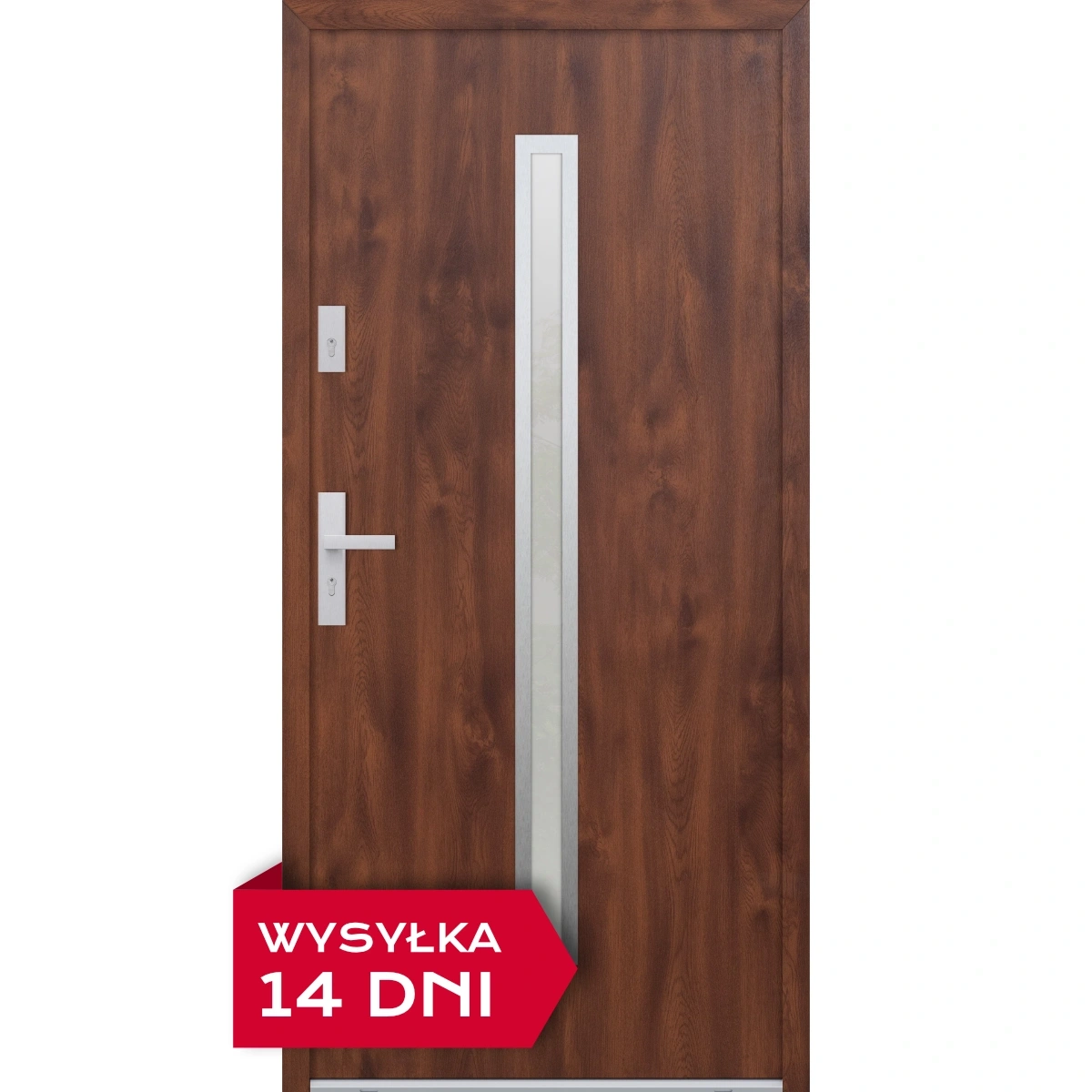 Drzwi zewnętrzne do domu stalowo aluminiowe 68 mm z szybą i klamką inox ATU68 orzech Program Czyste Powietrze M501