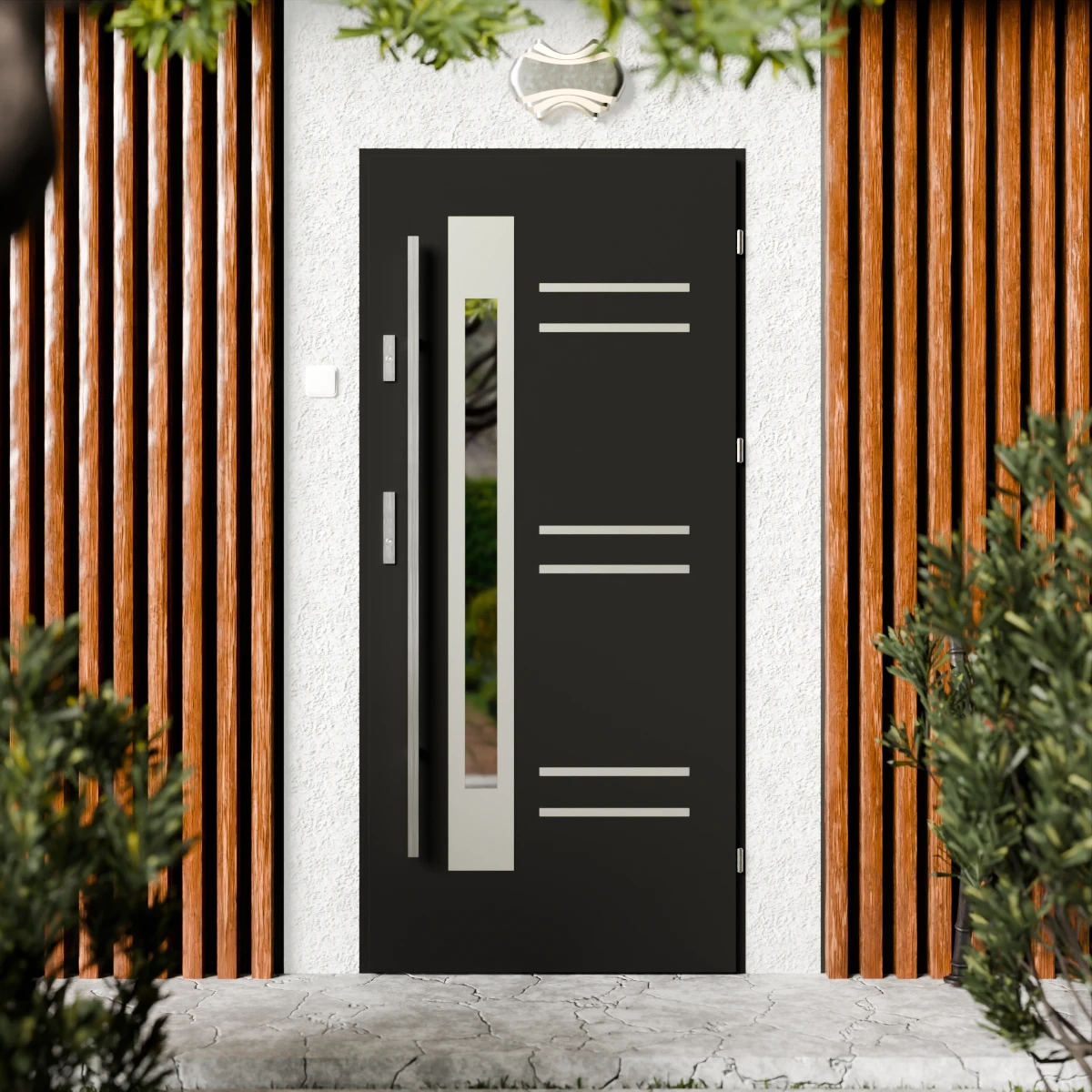 Drzwi zewnętrzne stalowe CK Drzwi 72 dostępne są w wersji jednoskrzydłowej z możliwością rozbudowy o dostawki boczne i górne, co pozwala na tworzenie imponujących i dopasowanych do bryły budynku stref wejściowych. Skrzydło ozdobione jest obustronnymi aplikacjami w formie poziomych pasków.