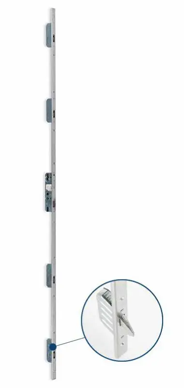 1 - przylga czterostronna 2 - bolce antywyważeniowe - 6 sztuk 3 - ościeżnica aluminiowa symetryczna 4 - zawiasy 3D - 3 sztuki 5 - zamek listwowy: pięciopunktowy zamek hakowy Winkhaus