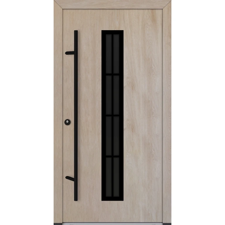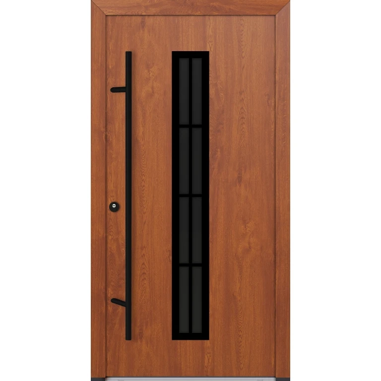 Skrzydło drzwiowe o grubości 82mm wypełnione jest XPS-em (styrodur). Poszycie stanowią blachy ze stali nierdzewnej pokryte folią PVC odporną na UV i warunki atmosferyczne. DS82 dostępne są w kolorze antracyt, biały, orzech, złoty dąb, winchester i dąb turner. Izolacyjność termiczna wynosi 0,68 W/m²K bez szyby i 0,89 - 1,09 W/m²K z szybą, w zależności od modelu szyby. Drzwi w standardzie wyposażone są w 5-punktowy zamek hakowy Winkhaus, zawiasy 3D z 6 bolcami zabezpieczającymi przed wyważeniem, 3 uszczelki systemowe - 2 w ościeżnicy i 1 w skrzydle oraz próg z izolacją termiczną. Jeżeli podoba Ci się pochwyt zwany inaczej antabą możesz wybrać prostokątny lub okrągły, inox lub czarny. Jeżeli natomiast wolisz standardowe rozwiązania możesz zamówić drzwi z klamką srebrną lub czarną po obu stronach skrzydła. Oferowane drzwi dostępne są wielu ciekawych modelach. Możesz wybrać drzwi pełne bez przeszklenia lub przeszklone czyli z szybą. Niezależnie od wybranego modelu przeszklenia można wybrać szybę przezroczystą, satynową (mleczną), przyciemnioną w kolorze grafitowym, odbijającą reflex również w kolorze grafitowym oraz popularne lustro weneckie.