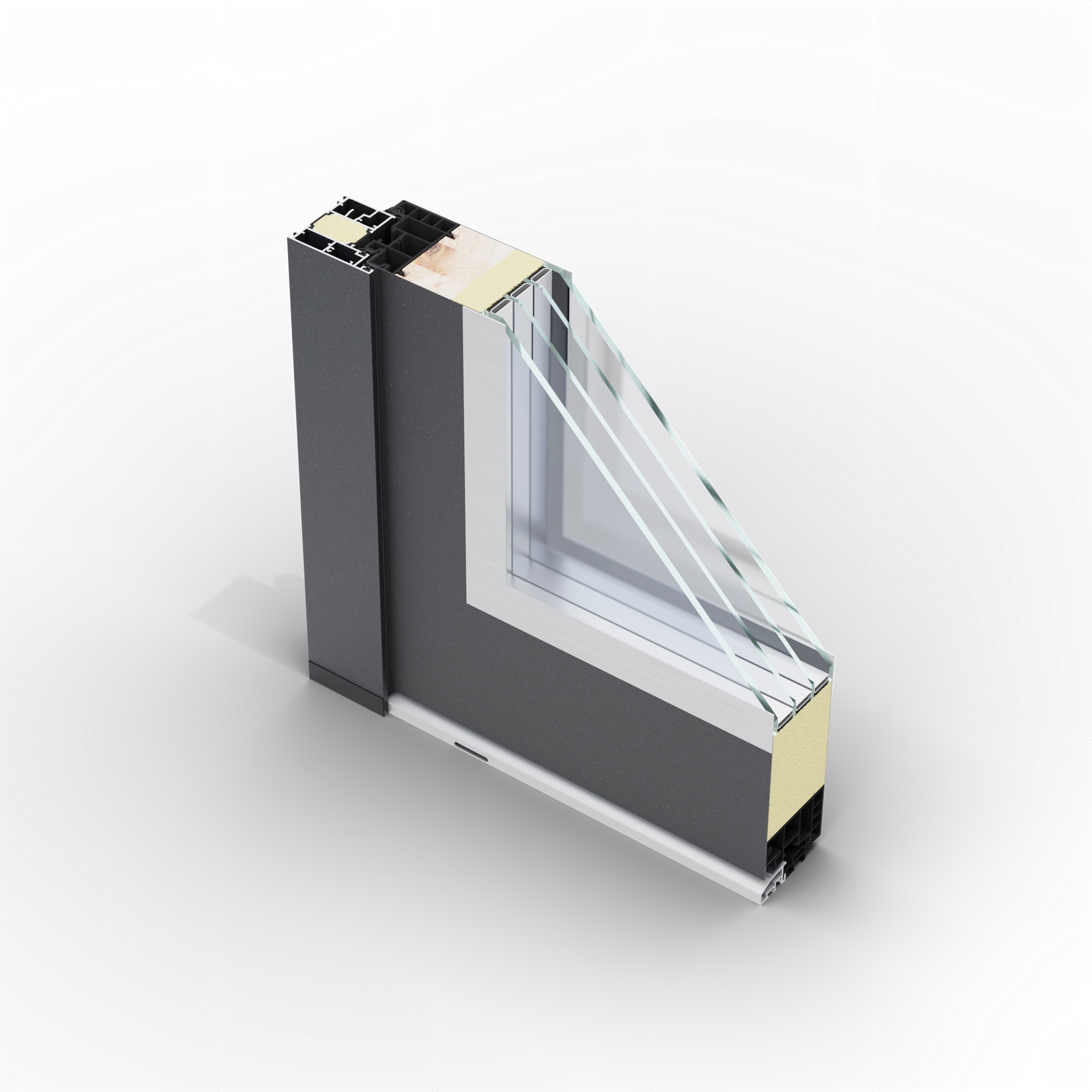 1 - wzmocnienie drewniane pod zawias 2 - grubość skrzydła 82 mm 3 - pakiet 4 szybowy z ciepłymi ramkami dystansowymi 4 - ościeżnica symetryczna aluminiowa 70 mm, grubość ścianki profilu 1.5 mm + powłoka folia PVC odporna na promieniowanie UV i warunki atmosferyczne 5 - 2 uszczelki w ramie 6 - 1 uszczelka w skrzydle
