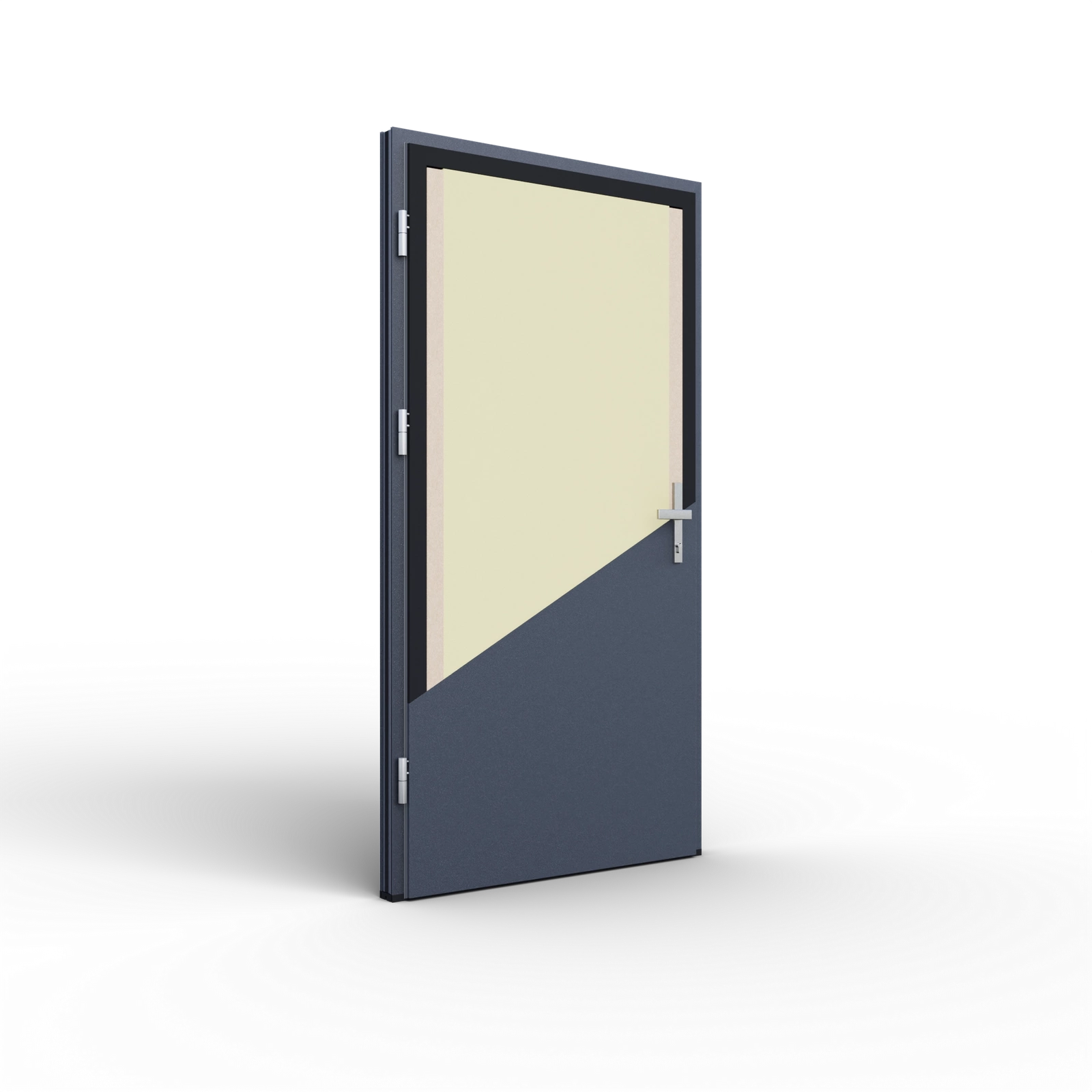 Drzwi stalowo aluminiowe jednoskrzydłowe DS82 dostępne są w standardowych wymiarach. Oferowane drzwi można wyposażyć w dostawkę boczną (doświetle) lub świetlik (naświetle).
