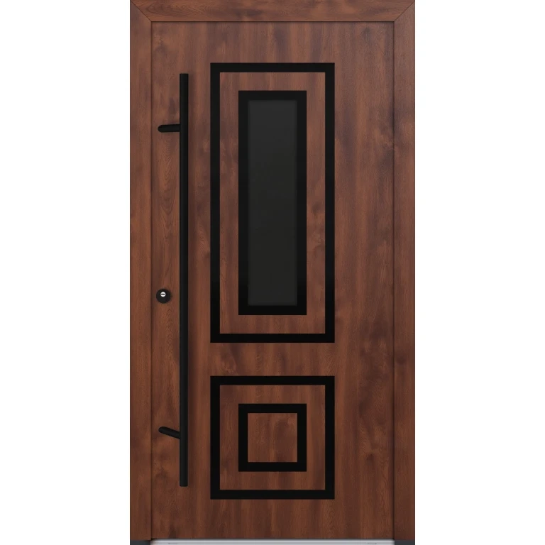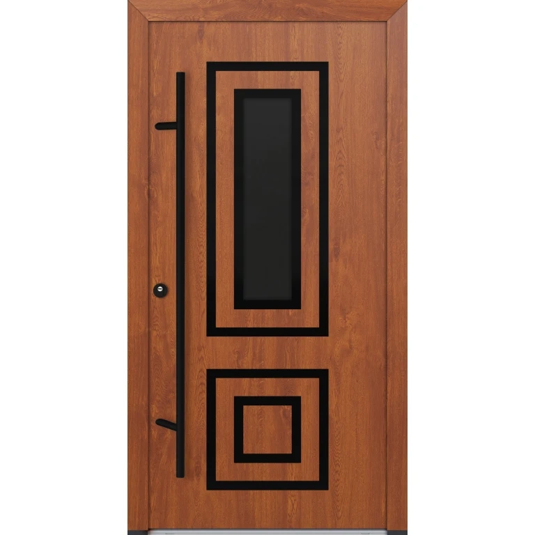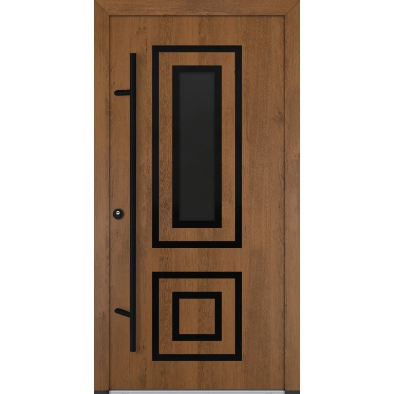 Skrzydło drzwiowe o grubości 82mm wypełnione jest XPS-em (styrodur). Poszycie stanowią blachy ze stali nierdzewnej pokryte folią PVC odporną na UV i warunki atmosferyczne. DS82 dostępne są w kolorze antracyt, biały, orzech, złoty dąb, winchester i dąb turner. Izolacyjność termiczna wynosi 0,68 W/m²K bez szyby i 0,89 - 1,09 W/m²K z szybą, w zależności od modelu szyby. Drzwi w standardzie wyposażone są w 5-punktowy zamek hakowy Winkhaus, zawiasy 3D z 6 bolcami zabezpieczającymi przed wyważeniem, 3 uszczelki systemowe - 2 w ościeżnicy i 1 w skrzydle oraz próg z izolacją termiczną. Jeżeli podoba Ci się pochwyt zwany inaczej antabą możesz wybrać prostokątny lub okrągły, inox lub czarny. Jeżeli natomiast wolisz standardowe rozwiązania możesz zamówić drzwi z klamką srebrną lub czarną po obu stronach skrzydła. Oferowane drzwi dostępne są wielu ciekawych modelach. Możesz wybrać drzwi pełne bez przeszklenia lub przeszklone czyli z szybą. Niezależnie od wybranego modelu przeszklenia można wybrać szybę przezroczystą, satynową (mleczną), przyciemnioną w kolorze grafitowym, odbijającą reflex również w kolorze grafitowym oraz popularne lustro weneckie.