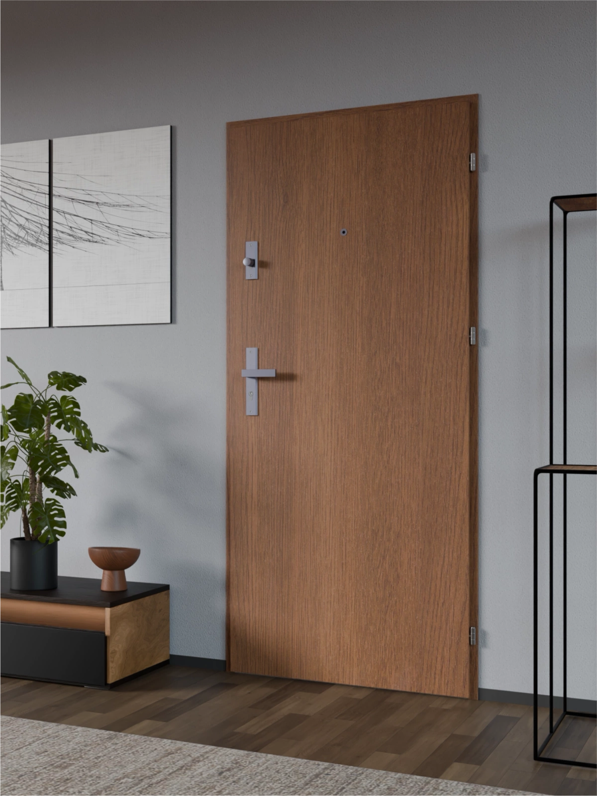 Ekonomiczne drzwi wewnątrzklatkowe wejściowe do mieszkania z klatki schodowej 55 mm stalowe złoty dąb A7
